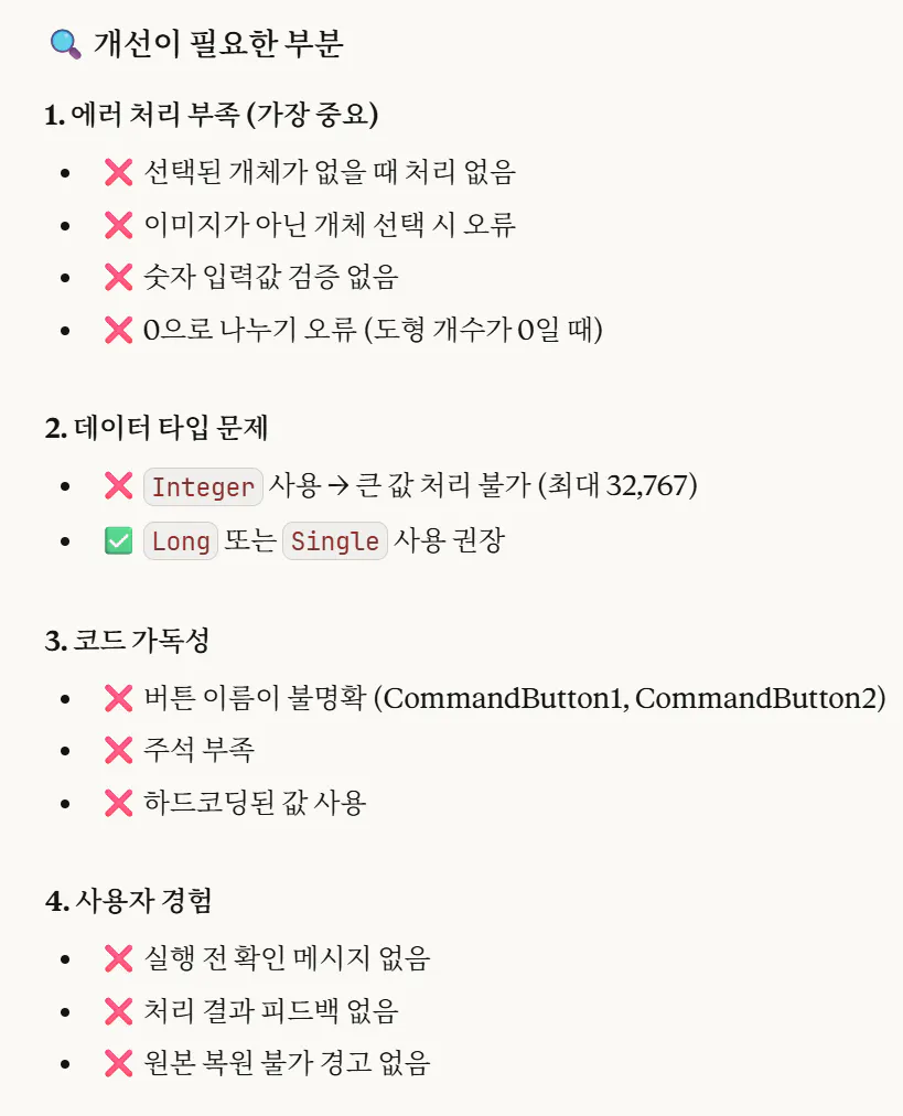 그 외에도 처음 이 VBA 코드를 만들때 말그대로 제 실력이 모자라서 구현하지 못했던 몇가지 기능들 또한 있어서 이 부분들도 추가해서 수정을 요청하고 티키타카로 수정했습니다.