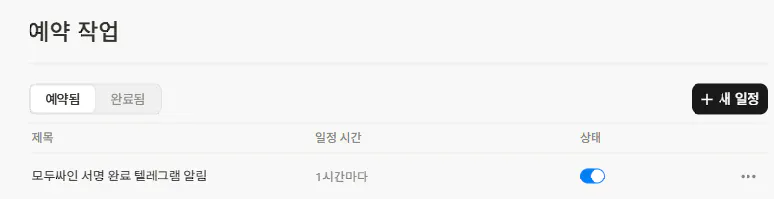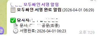 운영하고 있는 회사에서 모두싸인 싸이트를 통해서 계약관리를 하는데, 담당 직원이 다른 일을 하다가 생각날 때마다 들어가서 상대방이 계약서에 서명을 완료하였는지 확인하고 있음. 계약서가 회신되면 텔레그램 봇으로 메시지가 오도록 하고 싶었음.