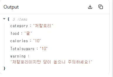 (실습은 칼로리에 따른 고칼로리/중칼로리/건강식 구분이었다면, 건강식이더라도 당류가 높으면 주의하는 문구를 추가했습니다!)