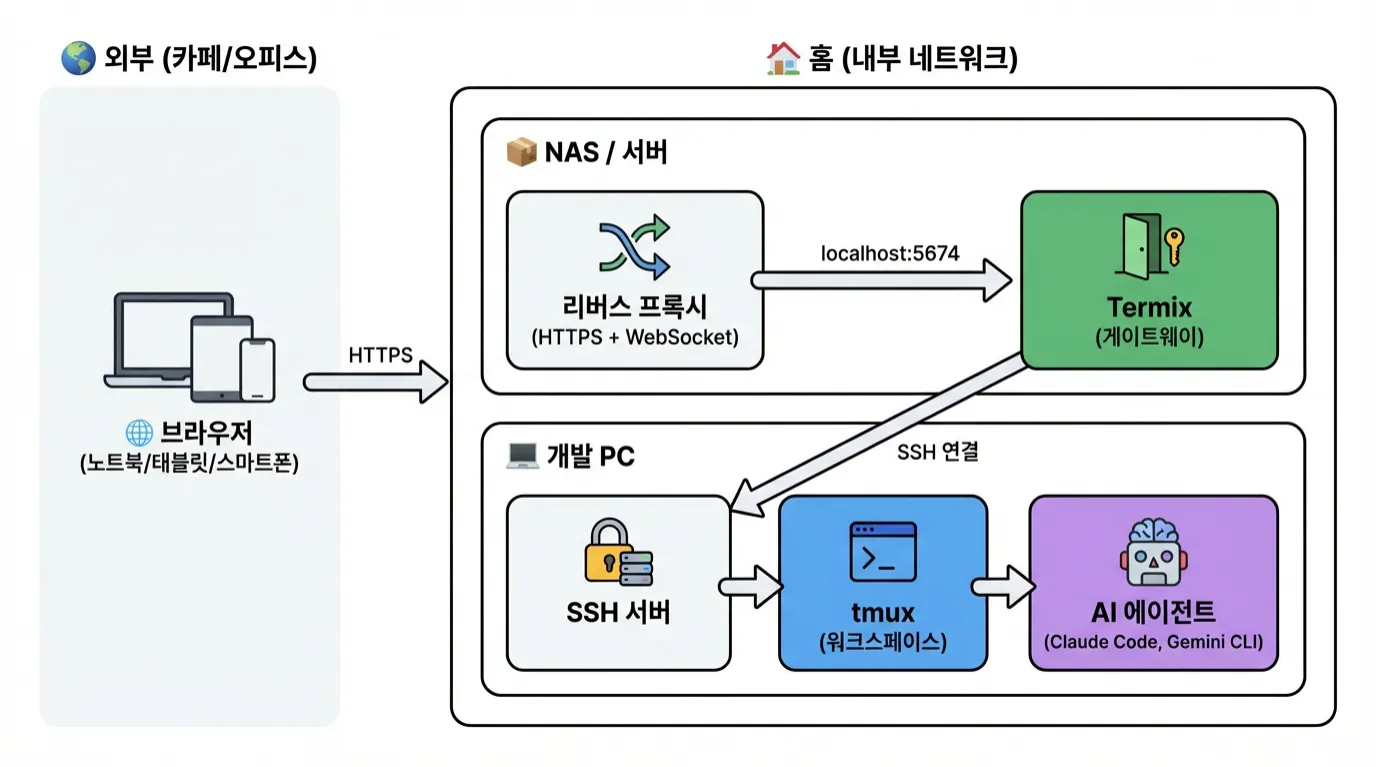 집에 있는 PC에는 Claude Code, Gemini CLI 등 AI 개발 도구들이 세팅되어 있지만, 외부에서 노트북이나 태블릿만 사용해야 할 때는 이 환경을 그대로 활용하기 어려웠습니다.