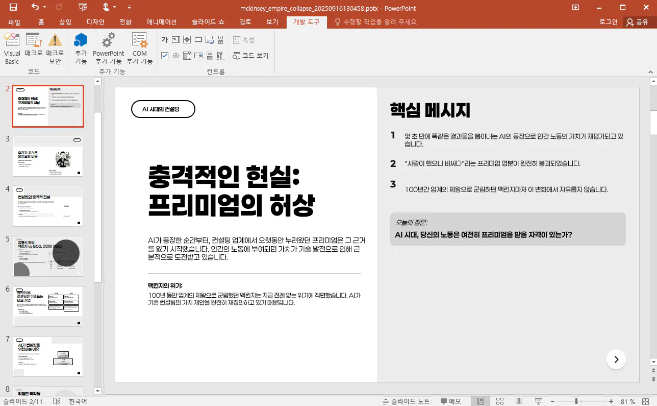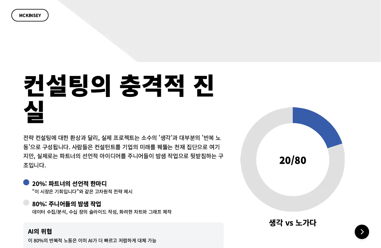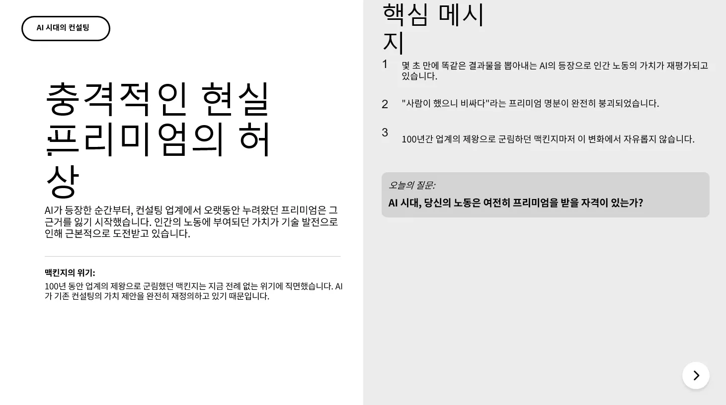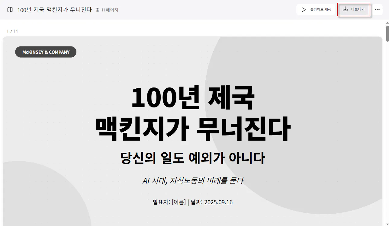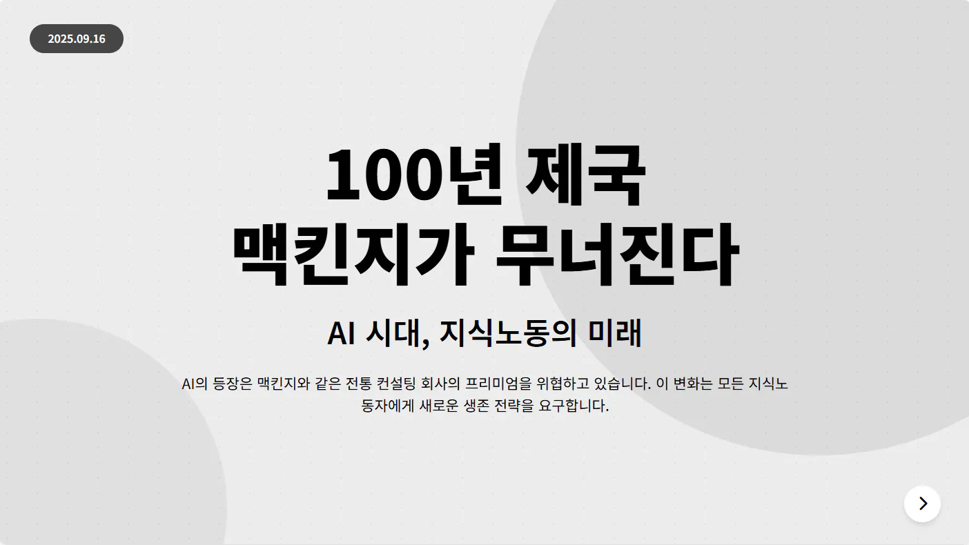 당신은 발표 자료 작성 전문가입니다. 첨부된 문서를 분석하고 발표자료 작성해 주세요.첨부파일 : "100년 제국 맥킨지가 무너진다, 당신의 일도 예외가 아니다.md"