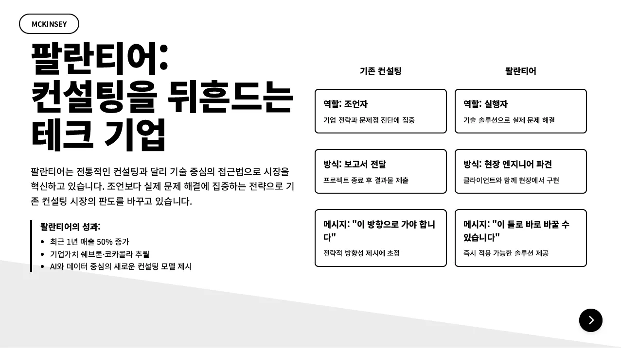 - 슬라이드 6: 기존 컨설팅 vs 팔란티어 프로세스 비교 플로우차트