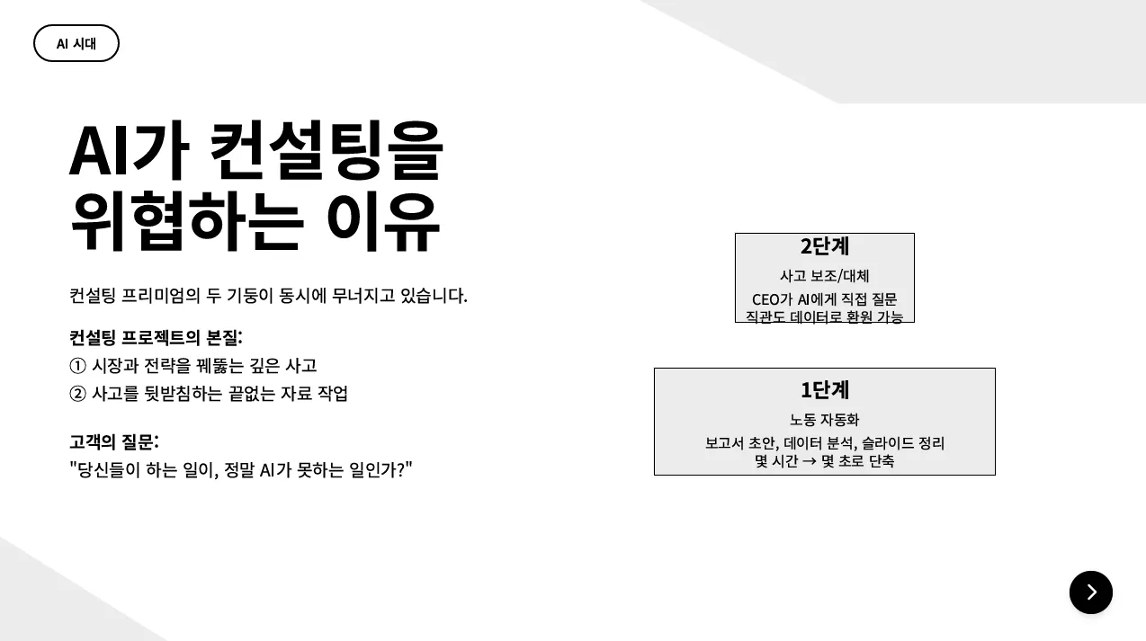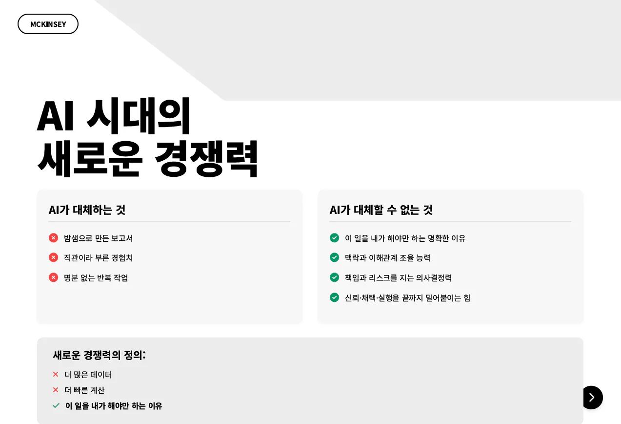 - 슬라이드 10: AI 대체 가능/불가능 영역 매트릭스첨부파일 : "100년 제국 맥킨지가 무너진다, 당신의 일도 예외가 아니다.MoA.md"