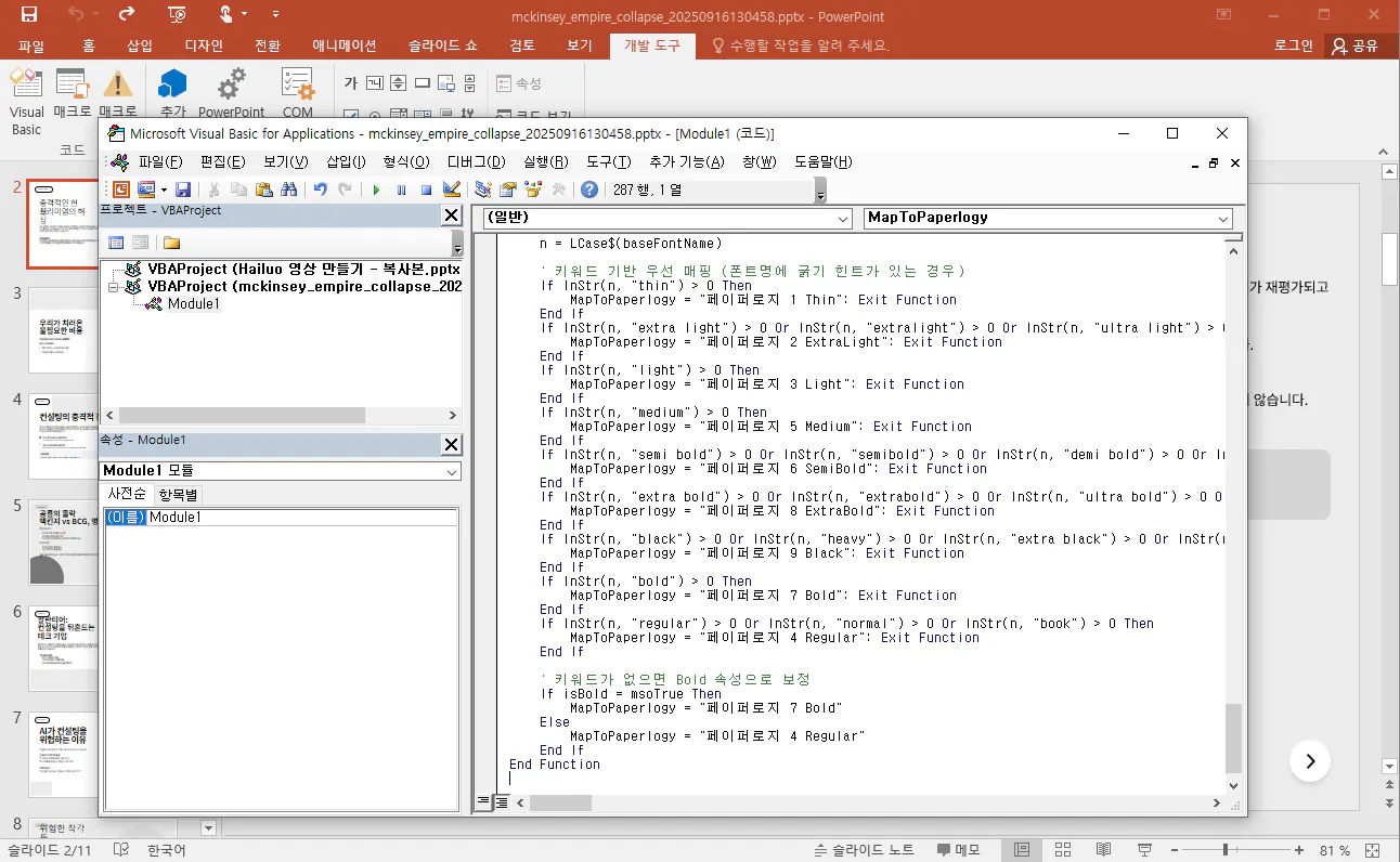 아티클 한 편을 젠스파크 AI 슬라이드로 전환하는 과정을 정리해 보았다. 이 과정에서 AI 모델별 링크 접근 방식을 비교하며 MoA의 강점을 확인할 수 있었다. 아티클을 기반으로 슬라이드를 제작하고, 시각자료(차트·그래프) 반영 여부를 실험했는데 결과는 기대 이상으로 만족스러웠다. 다만 슬라이드 크기(16:9)와 폰트 깨짐 같은 실무적 문제가 발생해 VBA 코드로 해결을 시도했다. 전반적인 과정은 ChatGPT를 활용해 진행했으며, 예상보다 훨씬 만족스러운 성과를 얻었다. 마지막으로, 시각자료 프롬프트 가이드를 활용해 다양한 차트·다이어그램을 체계적으로 테스트한 경험은 추후 사례로 별도 기록할 예정이다.