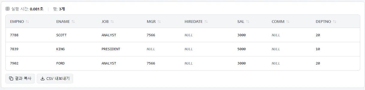 • "emp 테이블에서 급여가 3000 이상인 사람만 조회" 하면 아래 그림과 같이 SQL이 자동 실행됨.