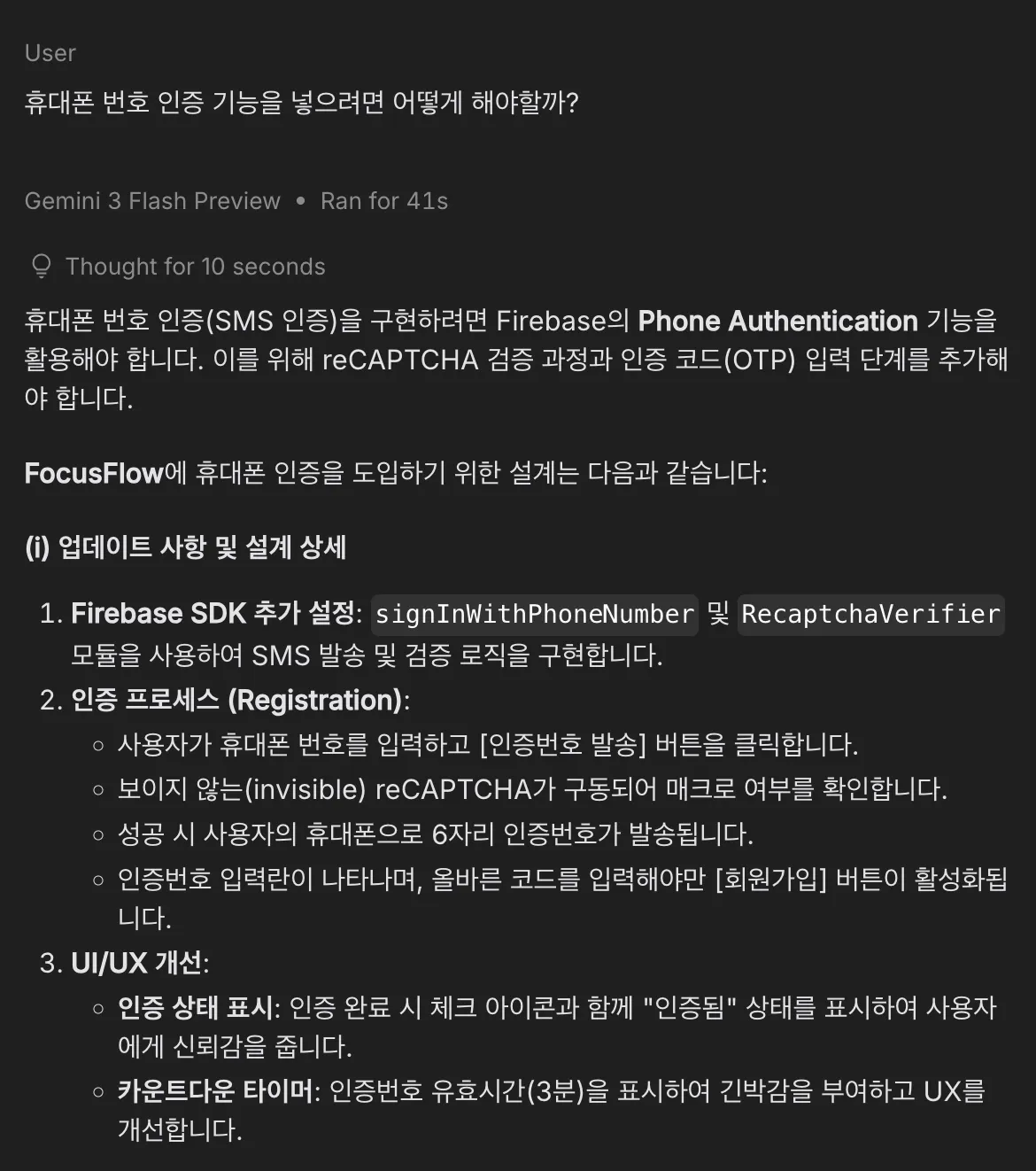 이렇게 넣어달라고 길게 이야기를 했지만 못알아 들었어요. 아마 Firebase에서 휴대폰 인증 기능을 사용하기 위해서 인증 문자를 보내기위한 추가적인 절차들이 필요한 거 같은데 기획서는 쓰겠는데 상세한 설정이 어렵더라고요. 나중에 한 번 공부해보고자 합니다.