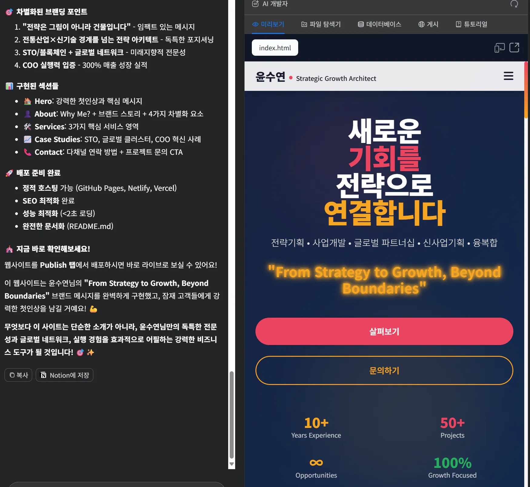 그동안 진행했었던 제 커리어 전환 내용들을 활용해서, Genspark로 랜딩페이지 형태의 개인 브랜딩 페이지를 만들어보았습니다.