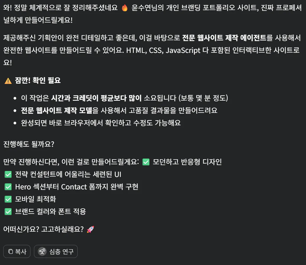 그리고 이 내용으로 개인 브랜딩 포트폴리오 사이트를 만들어달라고 지시를 하려고 했는데, Genspark는 무료 이용중이라 크레딧이 필요해서 다음 날에 진행을 해보게 되었습니다.