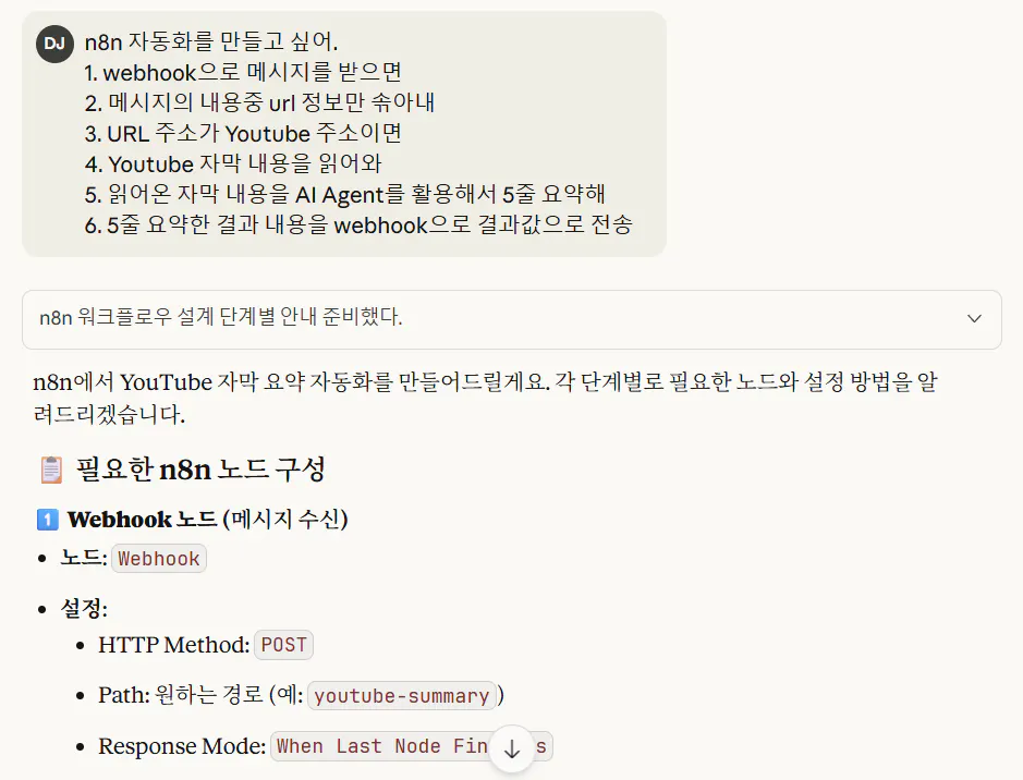 내가 구현하고자 하는 기능을 설명하고 n8n에서 어떻게 만들면 좋을지 물어보니 Claude가 설명을 잘해 주더라고요.
