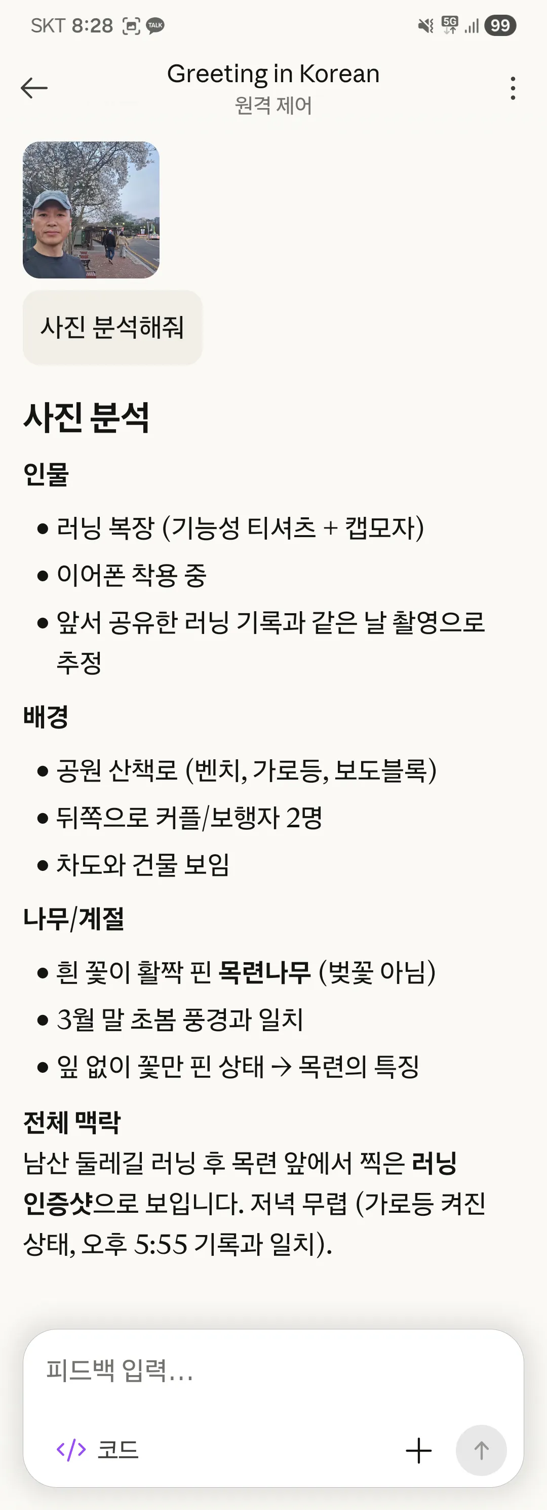 갤러리에만 있던 캡처가 구조화된 텍스트 기록으로 바뀌었다. 페이스, 심박수, 코스까지 한눈에 보이는 표 형태로. 그리고 목련 앞 셀카 한 장 덕분에 그날의 분위기도 메모에 남았다.