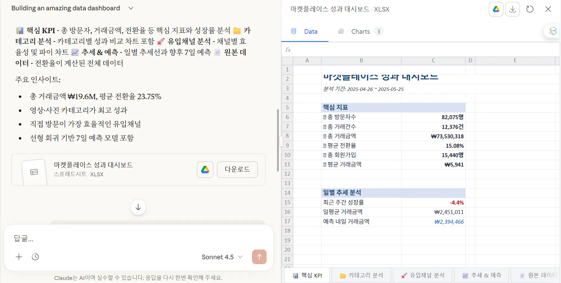 지 혼자 데이터 분석 작업을 하더니 excel file로 결과를 되돌려 줍니다.