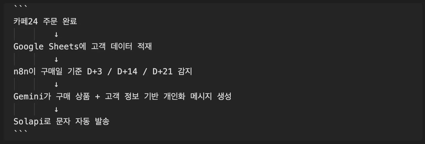 스택은 상당히 단순했습니다. n8n(자동화 워크플로우) + Gemini 2.5 Flash(AI 맞춤 메시지 생성) + AWS EC2서버) + Solapi(문자발송).