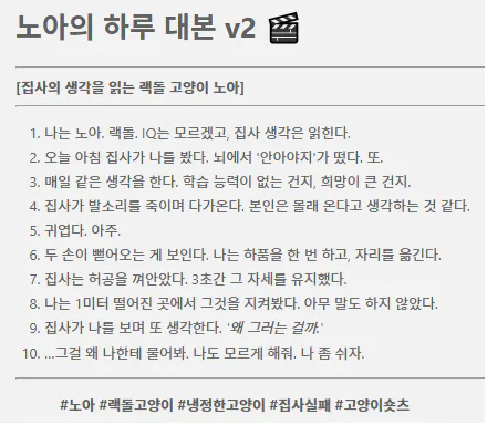 노아(랙돌 고양이) 숏츠용 10문장 대본을 만들어줘.