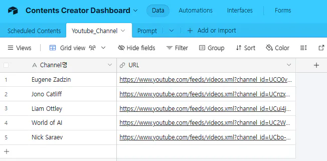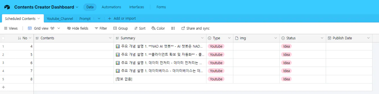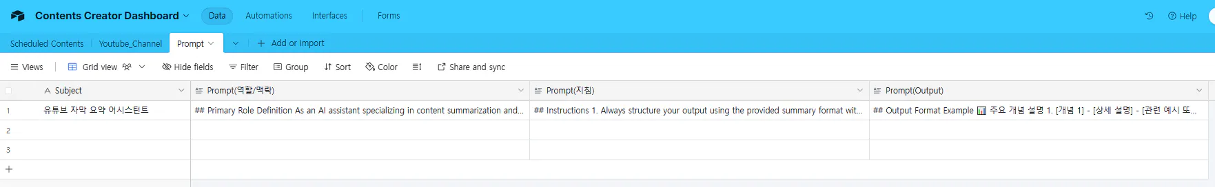 일단 이번주에는 Scheduled Contents, Youtube Channel, Prompt 3개의 Table을 만들었어요!