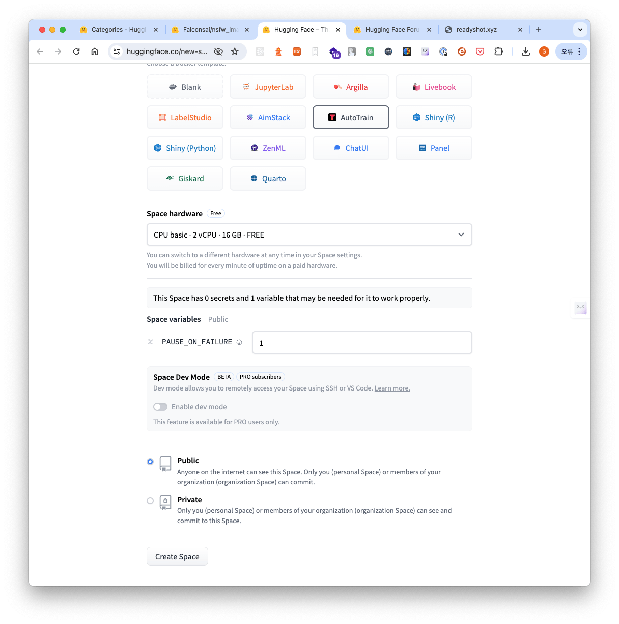 huggingface에 무료로 deploy 가능해서 몇개 모델 확인해 봤는데, 이상하게 몇개째 이후로는 서버 실행시 에러나는게 혹시, 무료 계정이라 deploy 서버 제한 같은게 있나요?