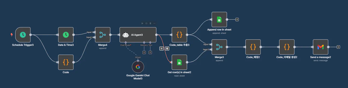 • n8n: 전체 자동화 워크플로우 구성 및 실행 (스케줄링, 데이터 처리, 이메일 전송 등)