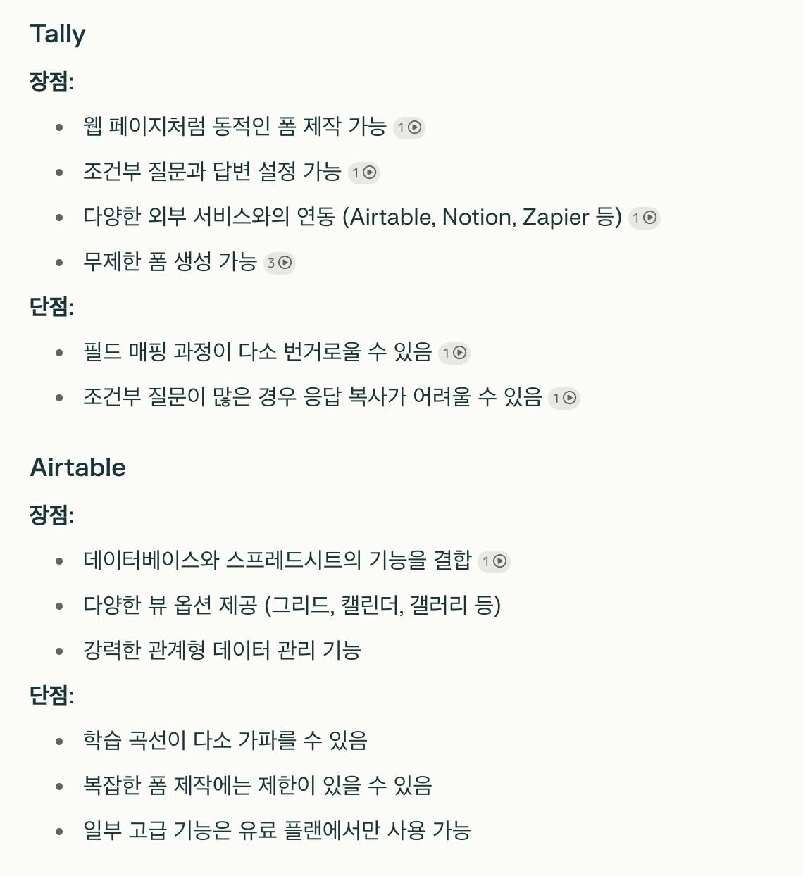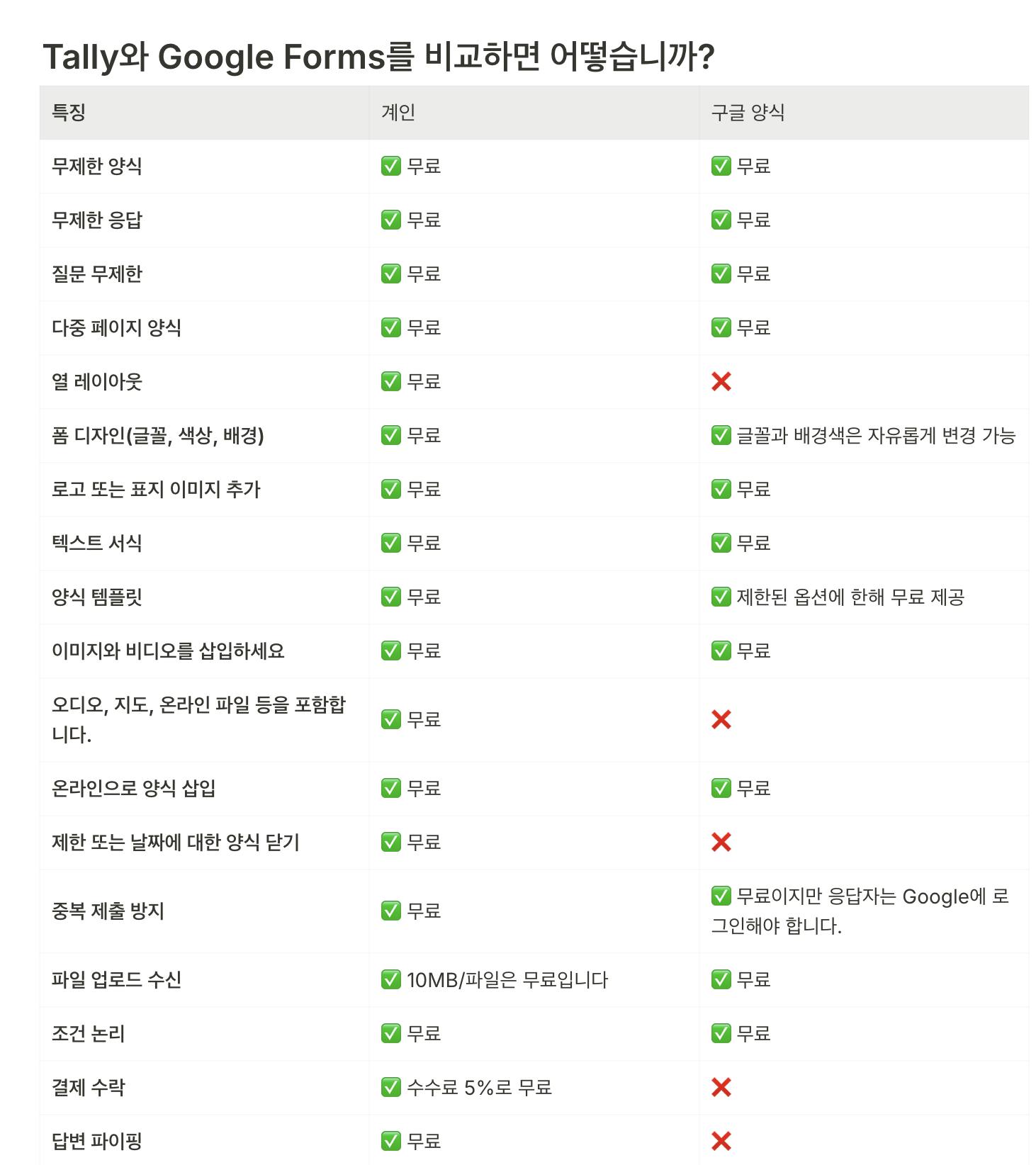 tally는 처음 사용해봐서 많이 탐색해보지 못했지만, 다른 툴과의 비교도 직접 해놓았더라구요 🙂 https://tally.so/help/tally-a-free-and-powerful-google-forms-alternative