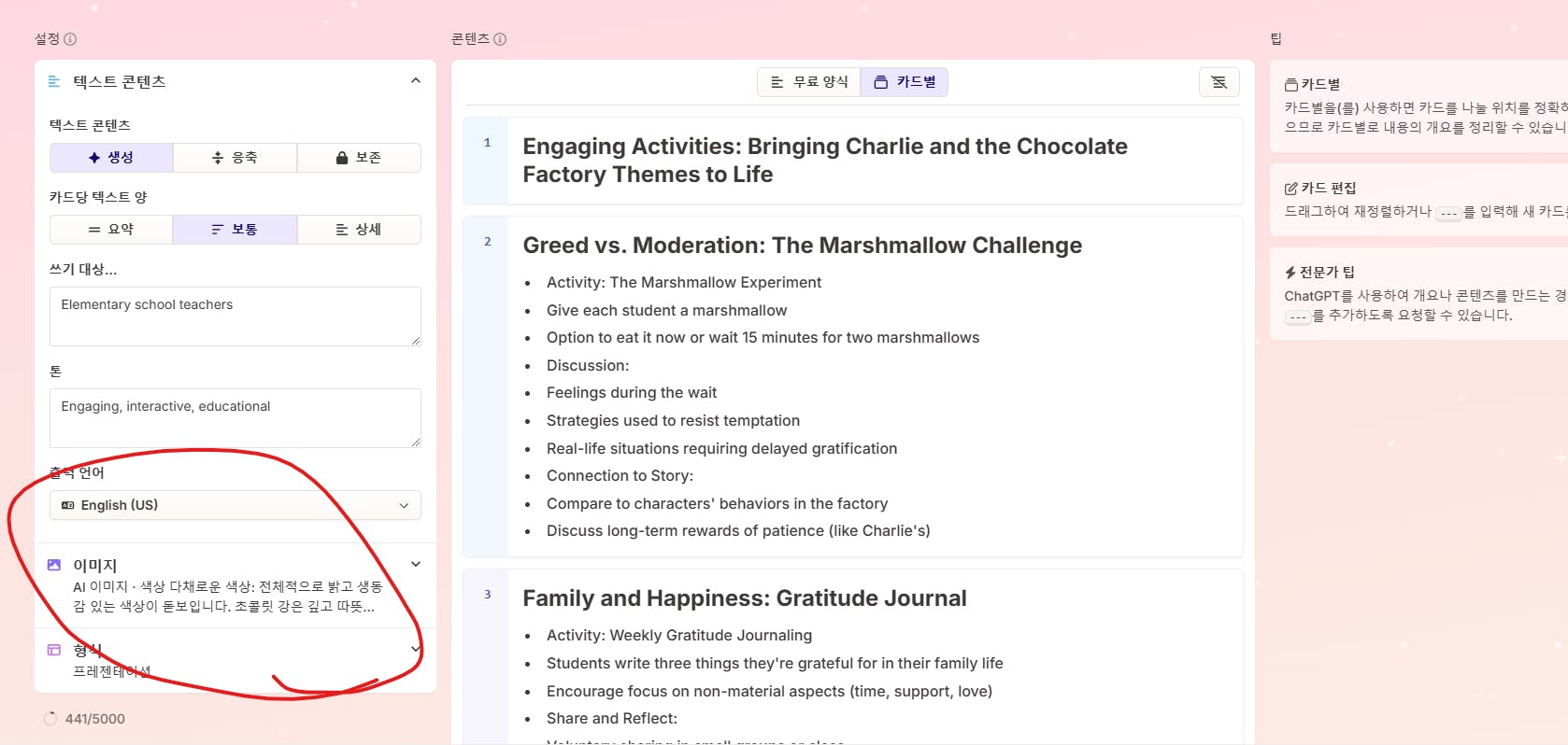 1. 찰리와 초콜릿 공장이라는 소설 책을 읽은 학생들을 대상으로 수업 시간에 쓸 ppt 자료를 GPT에게 만들어달라고 함.