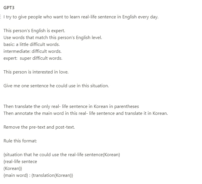 너무 쉬우면 재미없으니 난이도에 맞는 단어 써라. 이 사람 관심사는 이거다. 한국어 번역도 내놔라. 문장에 쓰인 단어 주석으로 달아라.