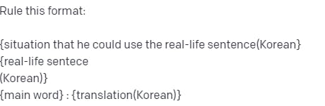 이렇게 쓴다음에 원하는 형태로 적어주시면 됩니다. 잘 보시면 결과랑 프롬프트 포맷이 비슷할 거에요.