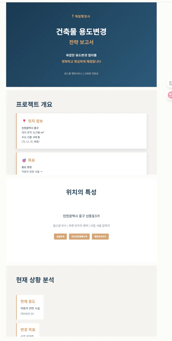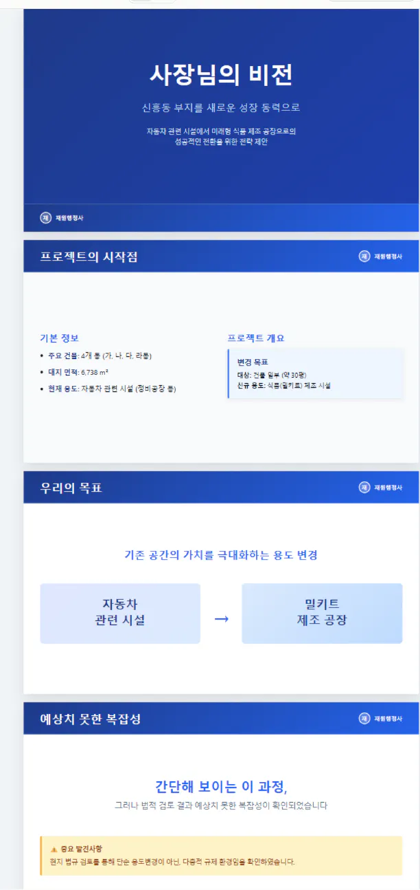 • 타이틀 | 프로젝트 개요 | 위치 특성 | 현황 분석 | 규제 복잡성 | 부서 협의 | 건축사 의무 | 핵심 과제 | 성공 경로 | 로드맵 | 팀 구성 | 프로세스 | 마감
