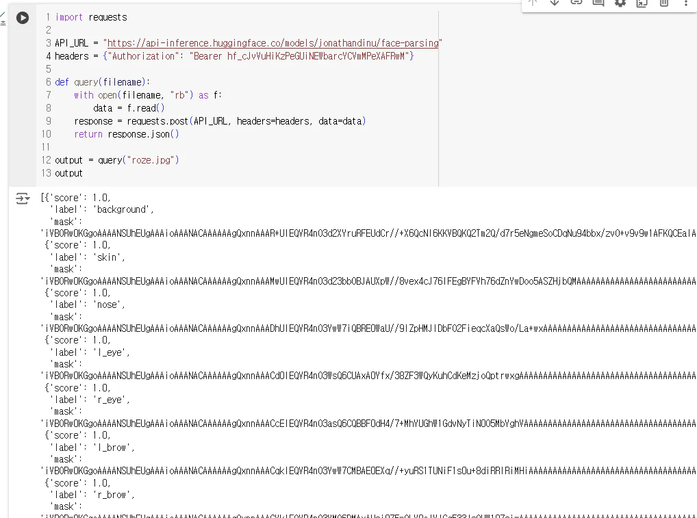 python용 api코드를 복사해서 구글코랩에 붙여넣고, 로제 사진과 토큰을 입력하여 실행해보았는데요~