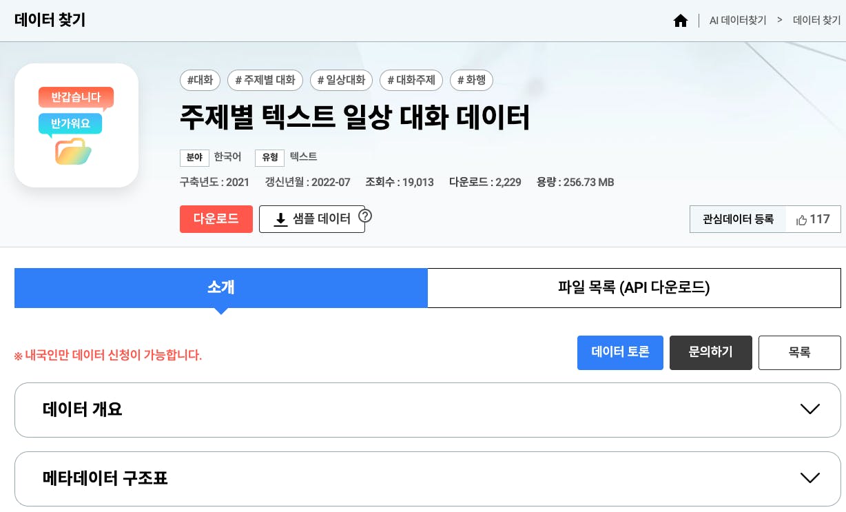 사실.. HuggingFace의 Datasets를 찾아보았지만.. 한국어 대화 데이터셋이 없어서.. AIHub에서 찾아보았습니다.