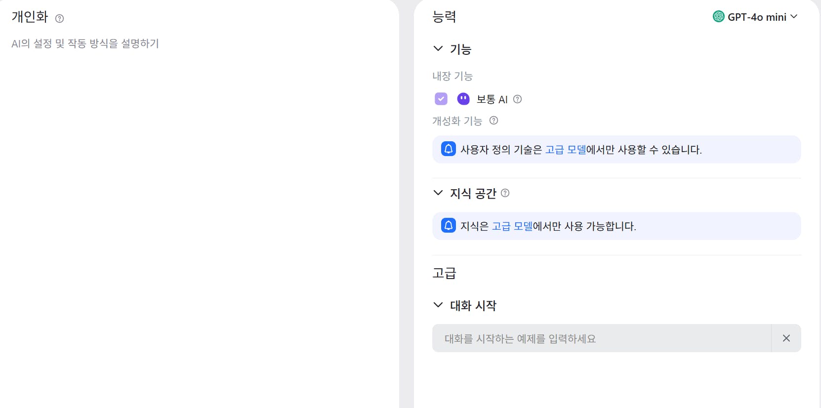 개인화 정보 입력 : 챗GPT instruction 기능과 유사 (유료 플랜만 입력 가능)