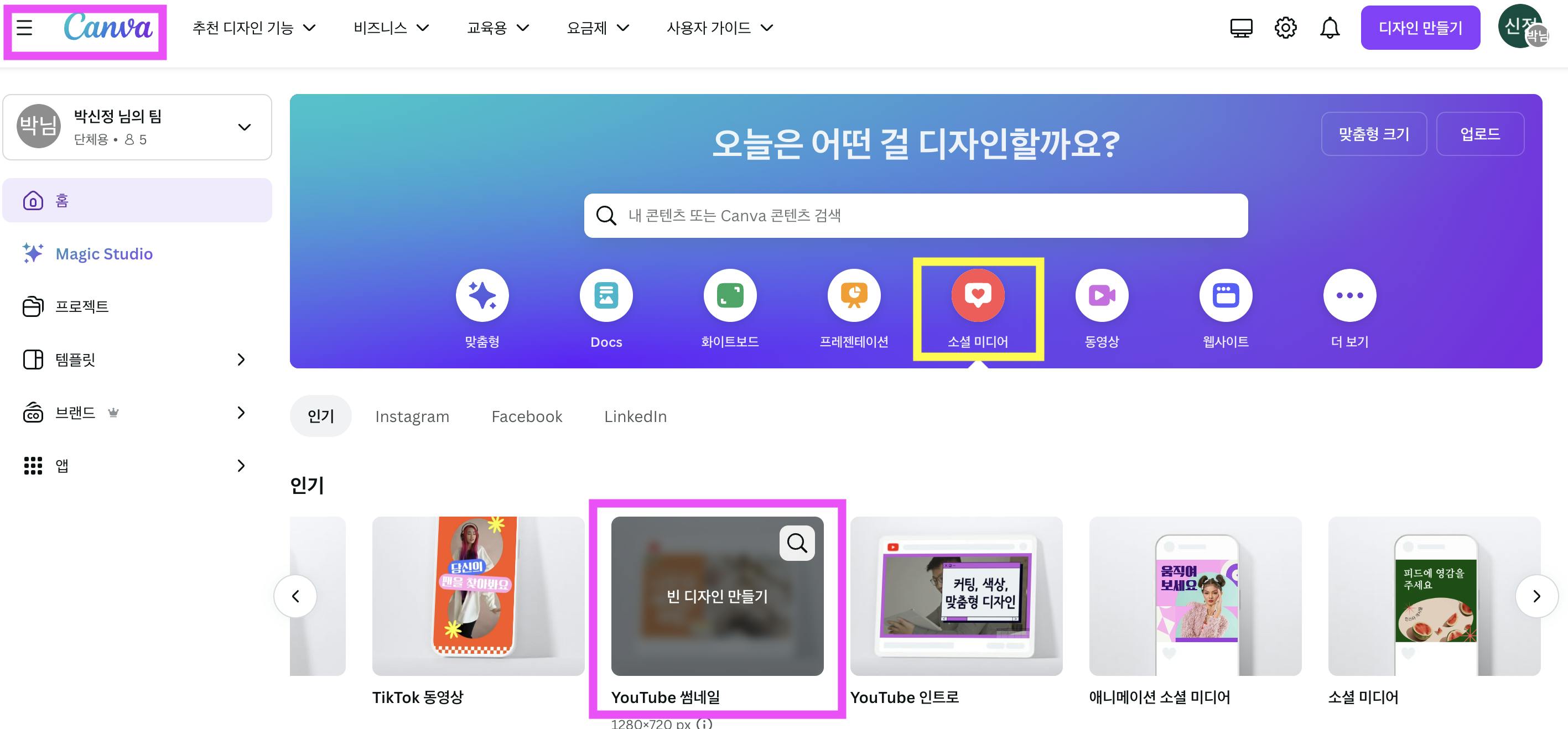 1. canva.com 홈 > 소셜 미디어(아이콘) > 유튜브 썸네일