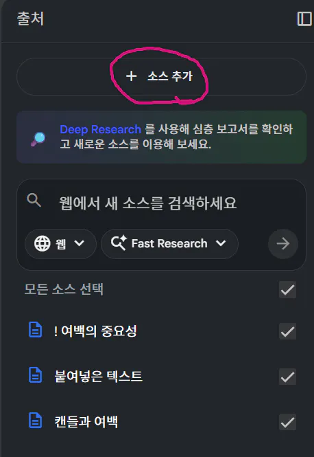 4. 추가로 첨부하고 싶은 자료를 왼쪽에 "+ 소스 추가"를 눌러 업로드 합니다.