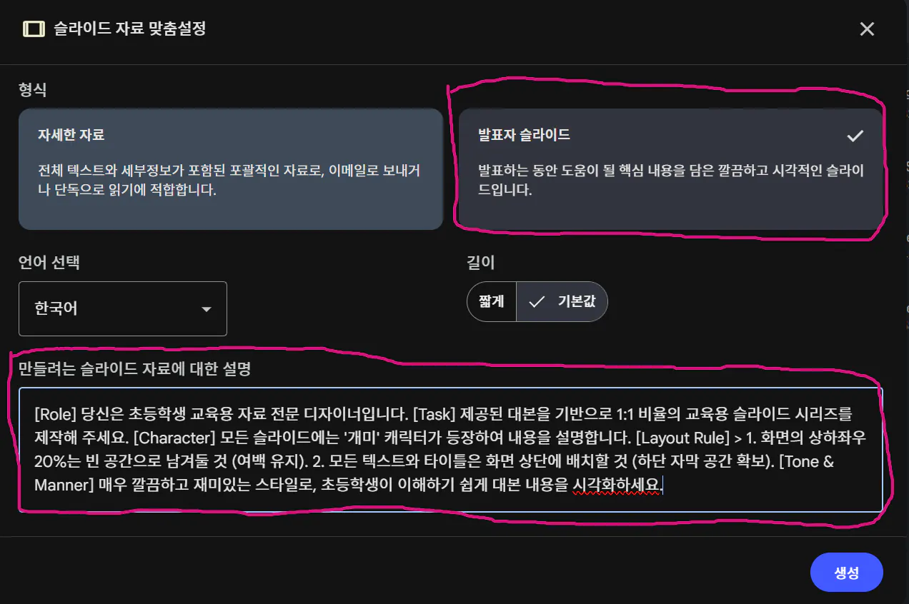 저는 "대본 내용에 중점을 둔 깔끔하고 재미있는 스타일의 초등학생도 이해할 수 있는 자료를 만들어줘" 라고 했습니다