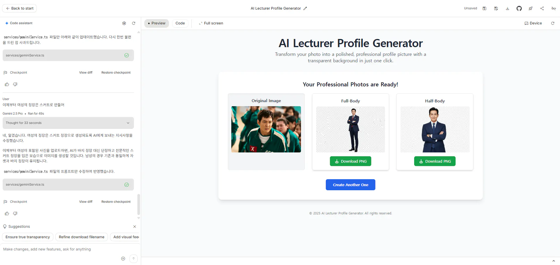 • 배경이 투명해지지 않고 모자이크 무늬로 처리됨 (Gemini Canvas)