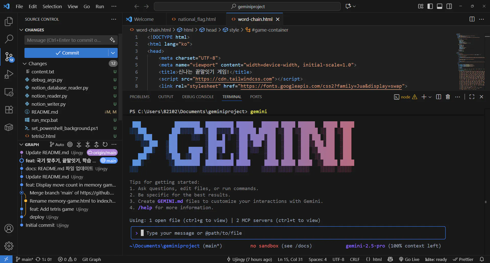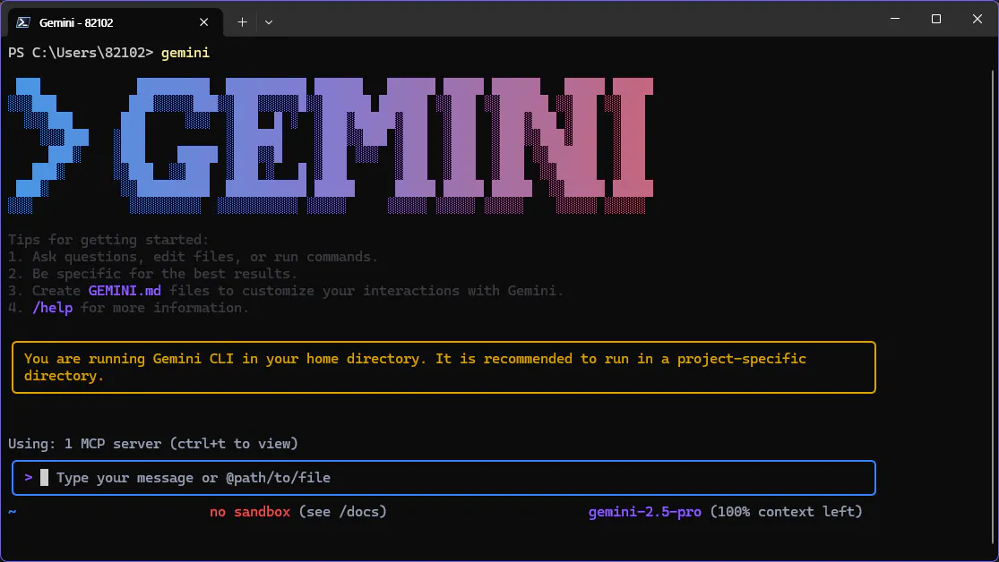 • 사용하다 보니 PowerShell보다 VScode 터미널에서 Gemini CLI를 실행하는 것이 편리했습니다.