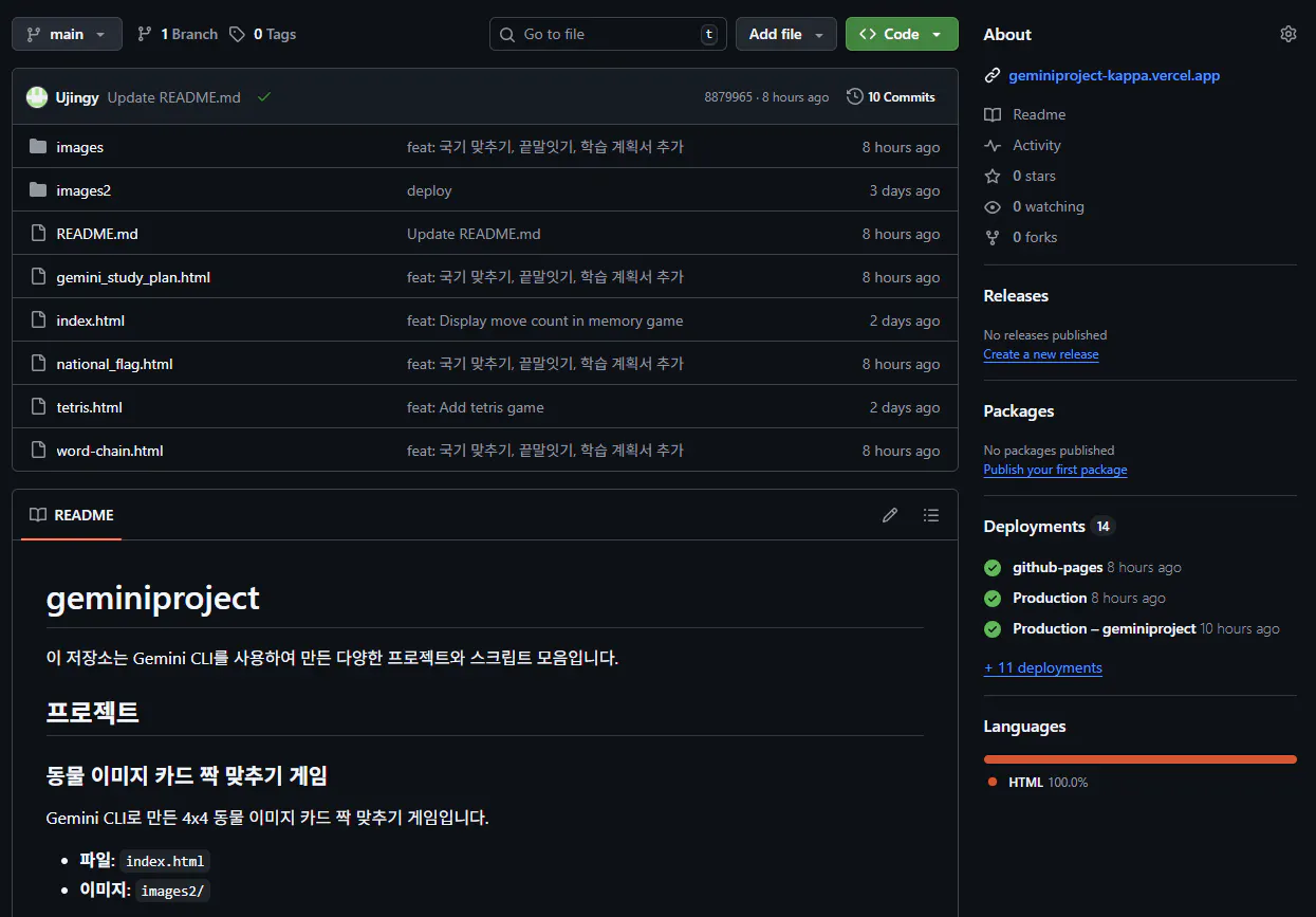 • 최종적으로 Gemini CLI + GitHub MCP 조합으로 카드 매칭 게임 파일을 repository에 업로드 성공