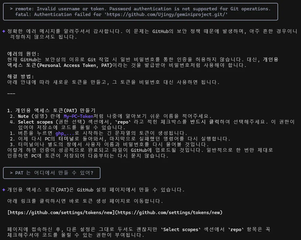 • 인증 문제 해결이 핵심 → GitHub Personal Access Token 필수