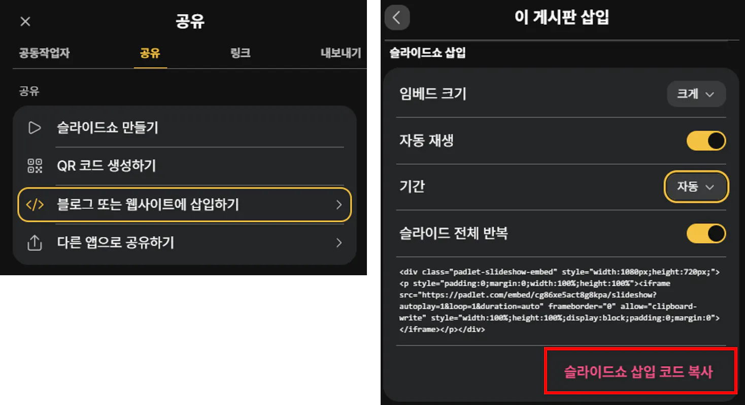 1. : 패들렛의 독서모임 도서목록 → 공유 > </> 블로그/웹사이트 삽입 → 구글 사이트 삽입 > 소스코드에 붙여넣기 → 슬라이드쇼 형태로 임베디드