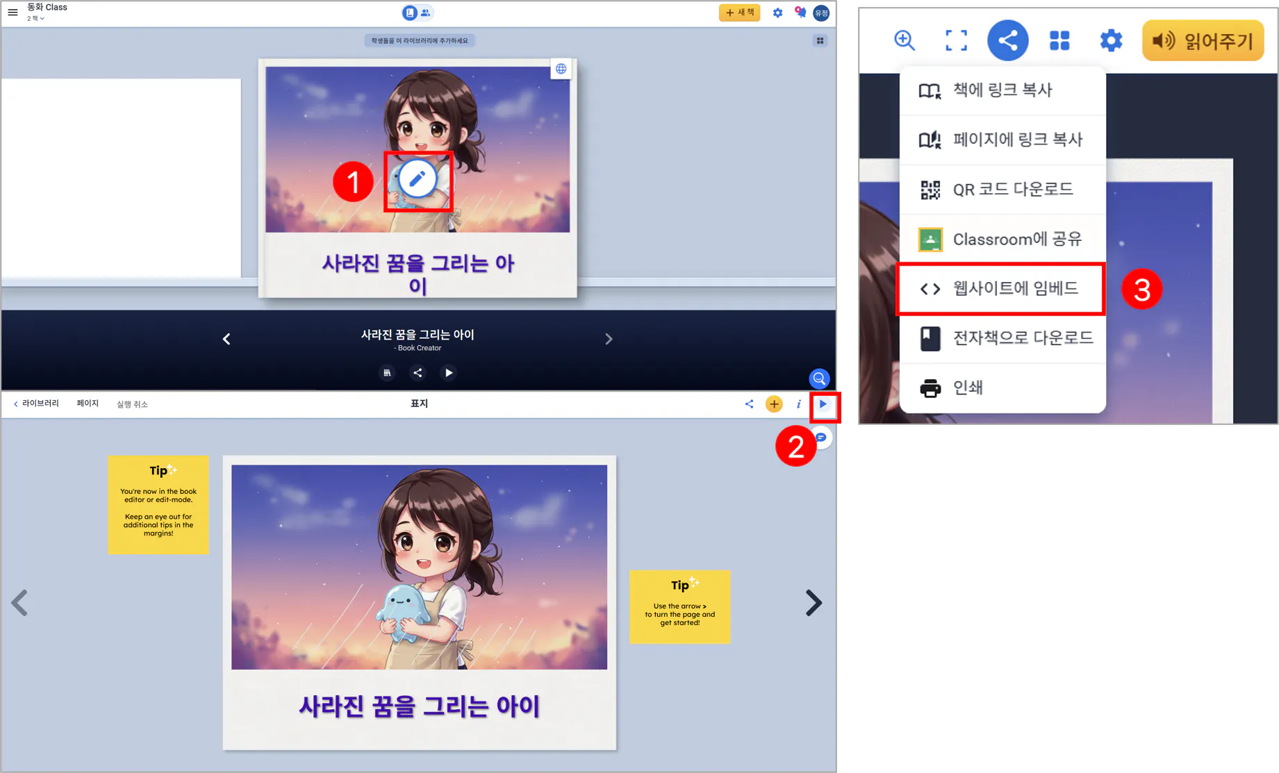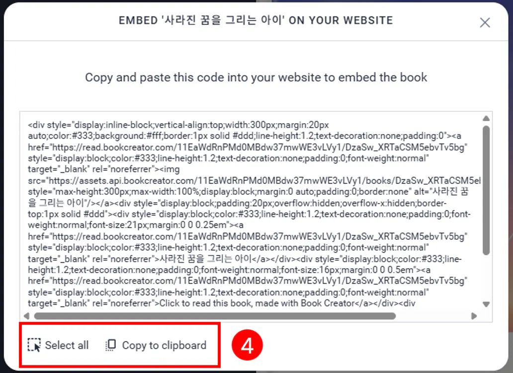 5. 책 자료실: 북크리에이터에서 공유 옵션 > <> 웹사이트 임베드 → 소스코드 전체 복사 후 구글 사이트 삽입