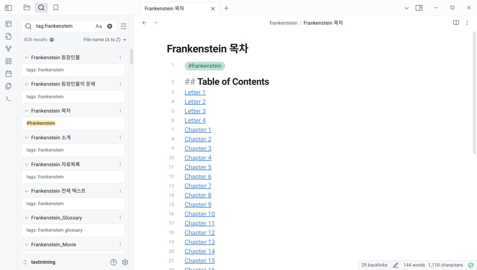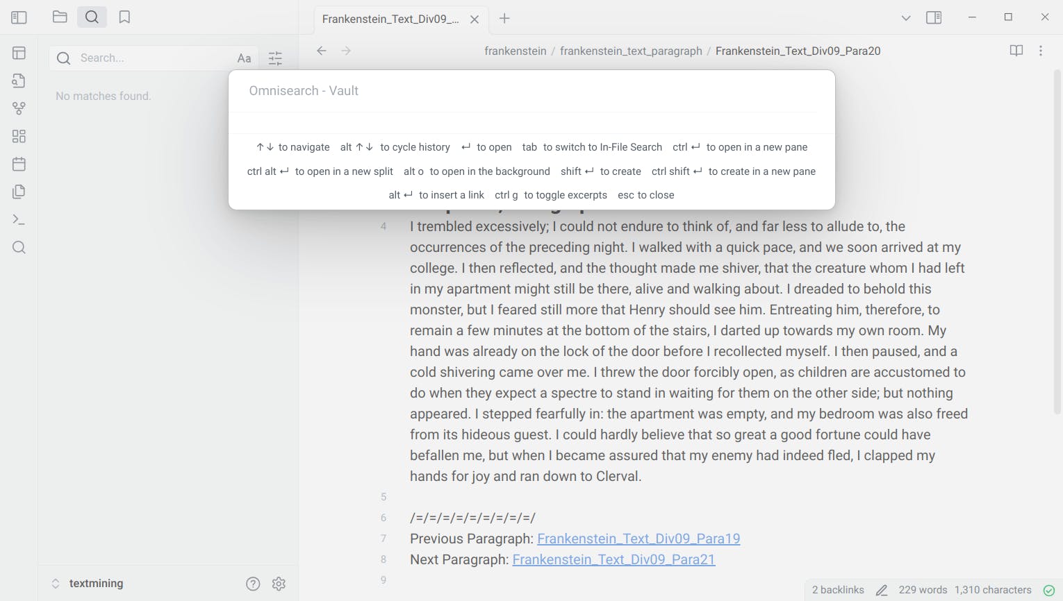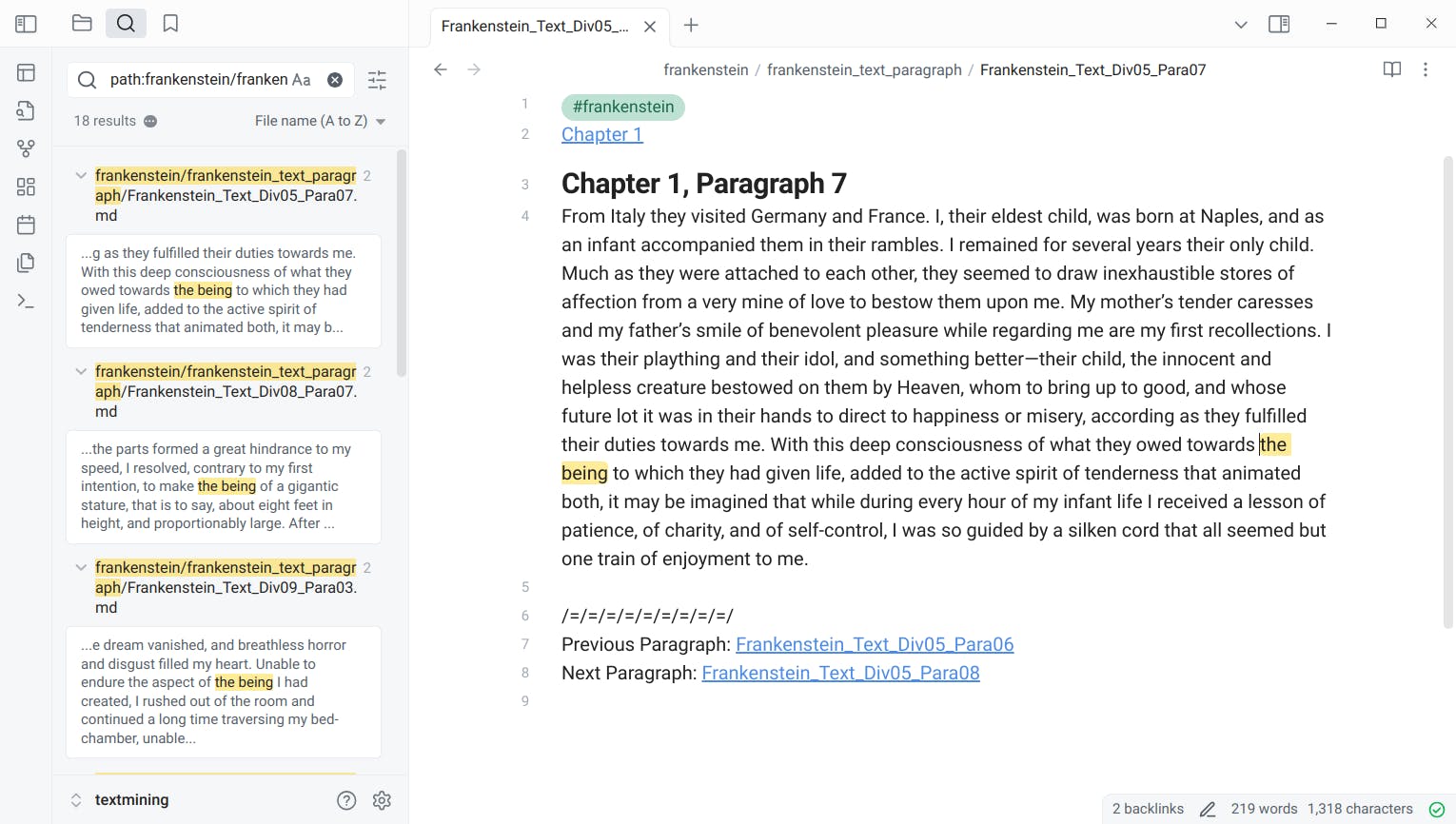 - 예를 들어, 아래 검색 결과는 Frankenstein 소설 텍스트를 문단 단위로 나눈 노트가 있는 폴더만 검색한 결과입니다.