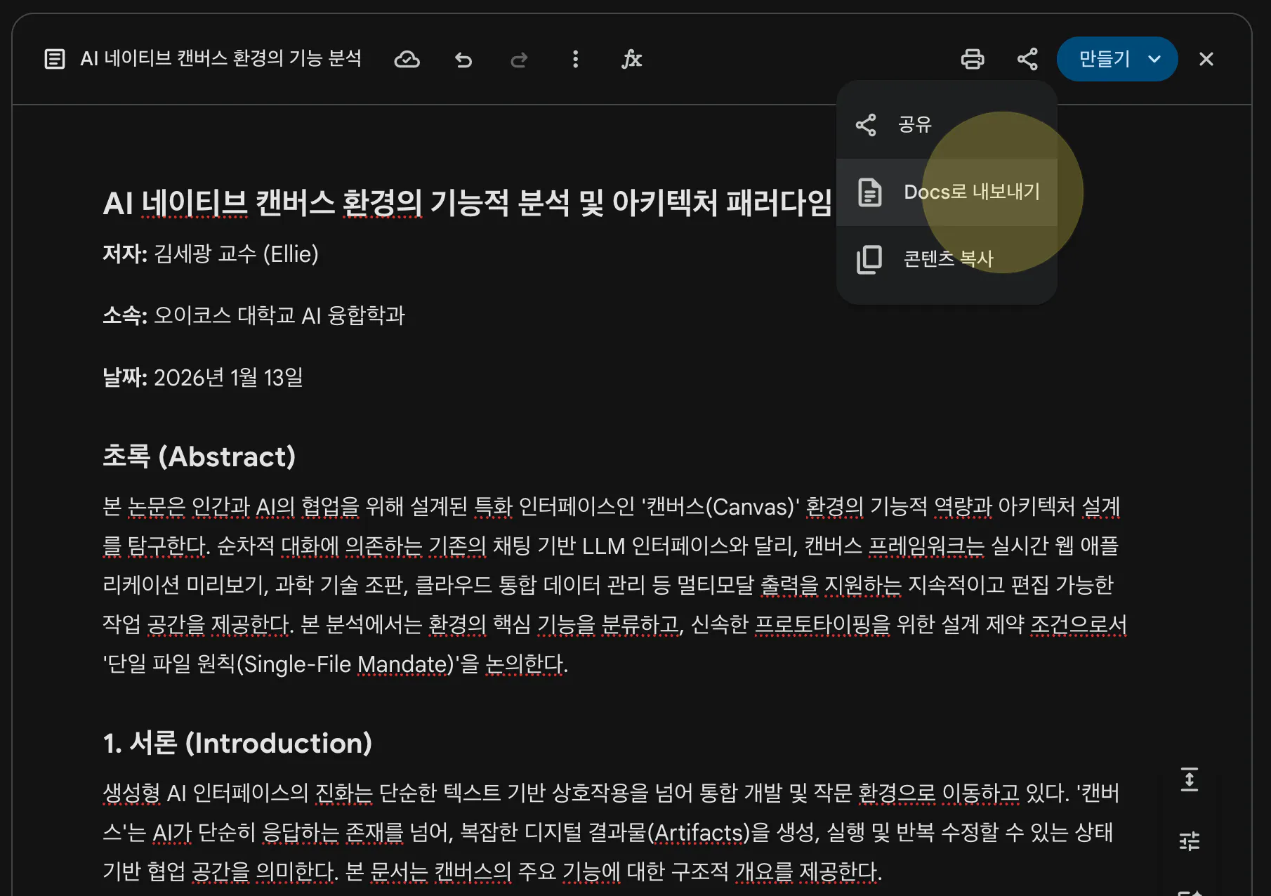 문서를 작성한 뒤 우측 상단의 [만들기] 메뉴를 살펴보면서