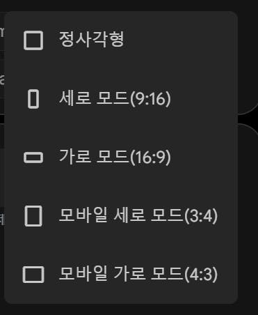 정사각형, 세로모드(9:16), 가로모드(16:9), 모바일 세로 모드(3:4), 모바일 가로모드(4:3)