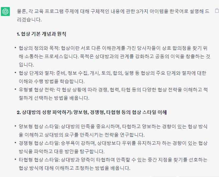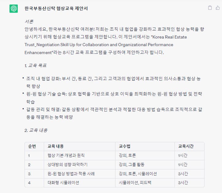 챗GPT가 전문가가 그 분야를 쓰기에는 별로 일수 있지만 잘 모르는 분야를 처음 다루는 사람들이 접근하는 방법으로는 더할나위 없다는 것을 느꼈습니다. 제가 처음 기업교육관련 일을 할때는 아예 제안서 내용에 뭐가 들어가야 하는가를 전혀 알수 없었거든요..