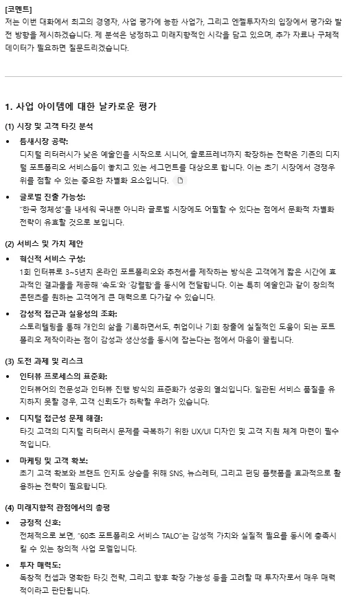 너는 사업가이자, 사업평가자이자, 투자자로서 냉정하게 평가하고 발전 방향을 제시해야 해.