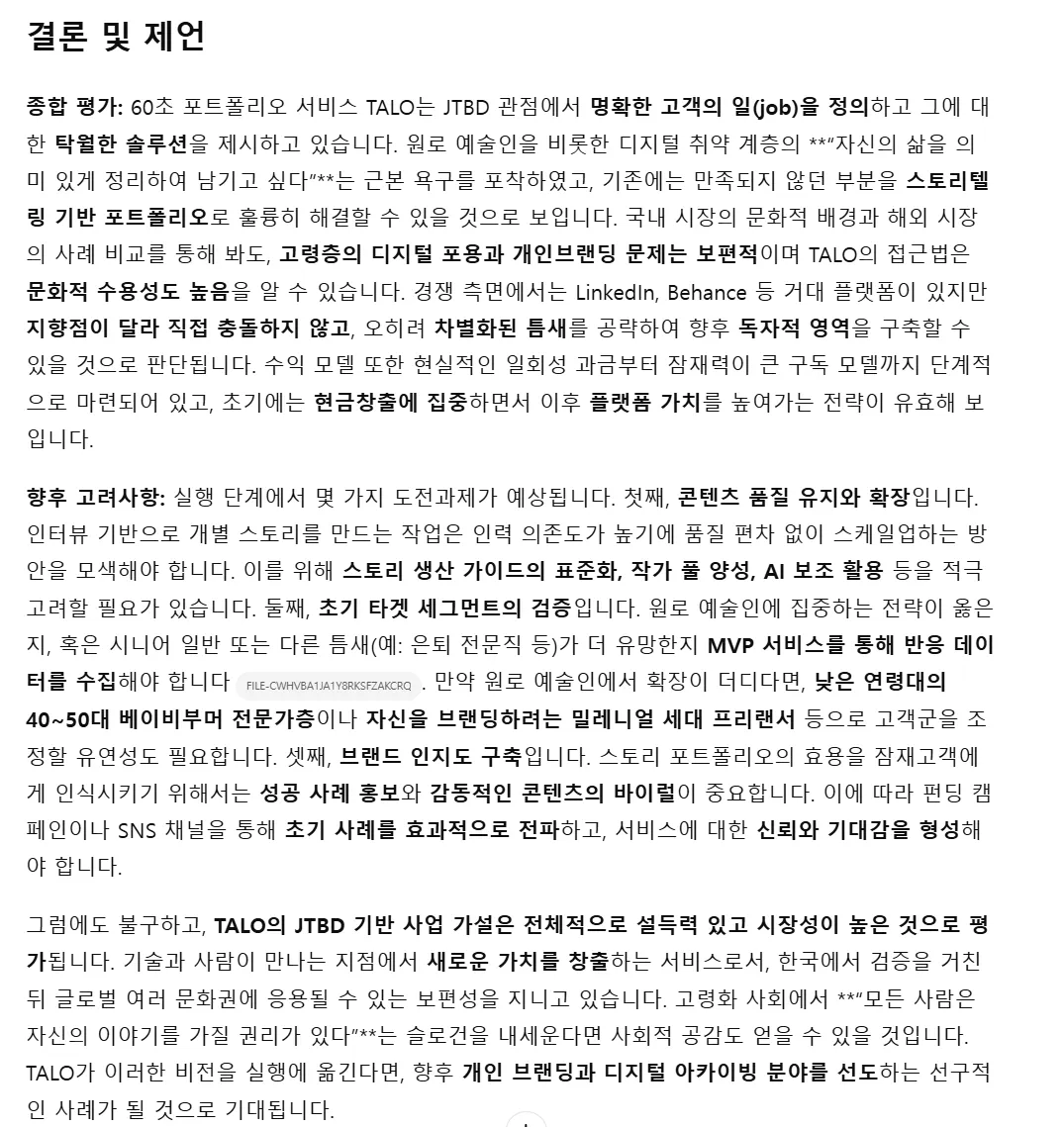 "다음 단계를 위해 추천해준 툴 6개 다 진행해줘! 가장 중요한 것은 나는 구체적이었으면 좋겠어. 할루시네이션은 안되지만 적정한 사례를 예시로 드는 것은 해줬으면 해. 2. 그리고 무엇보다 나는 이걸 하려고 했는데, " JTBD 이론"이야. 여기에 대해서는 네가 웹서치 하겠지만, 내가 참고하는 자료도 첨부했어. 이걸 참고해줘. 여기서 나의 사업(60초 포트폴리오 서비스 TALO)을 바탕으로 "# 사업 가설 연구 지침" 내용을 작성해줘."