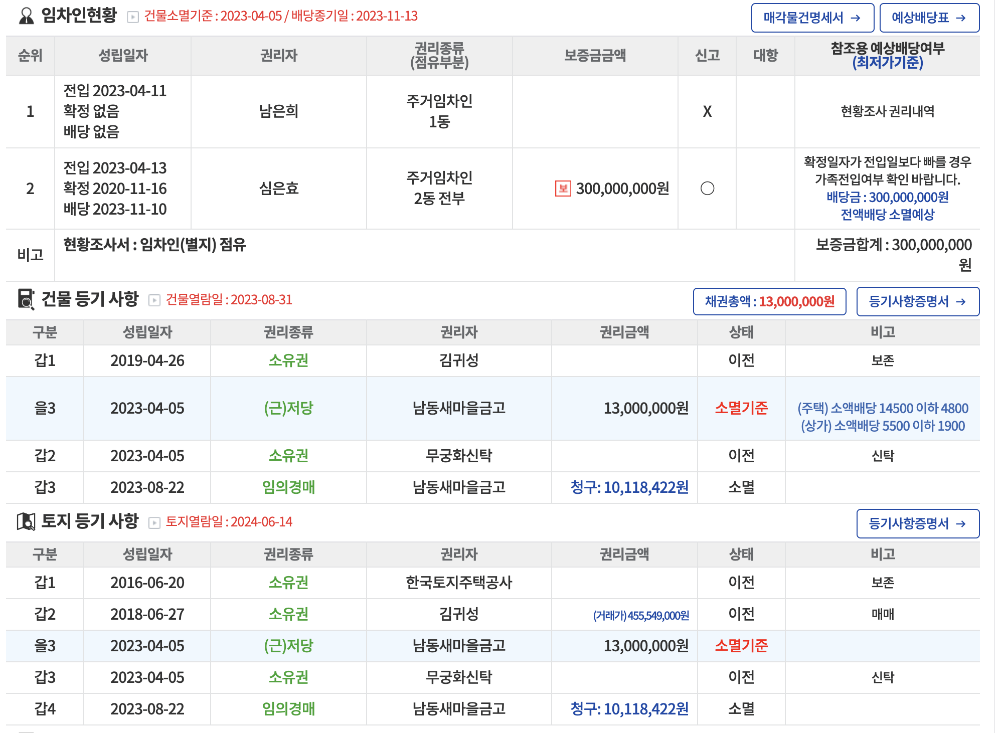 제공된 스크린샷에 따르면, 임차인 남은희와 심은호의 전입신고일은 각각 2023년 4월 11일과 2023년 4월 13일입니다. 건물 등기 사항에 따르면 근저당권 설정일은 2023년 4월 5일입니다. 근저당권 설정일이 임차인들의 전입신고일보다 빠르므로, 이 경우 임차인들은 대항력을 가지지 못합니다. 이는 경매 시 임차인들이 보증금을 보호받지 못할 가능성이 높다는 것을 의미합니다.