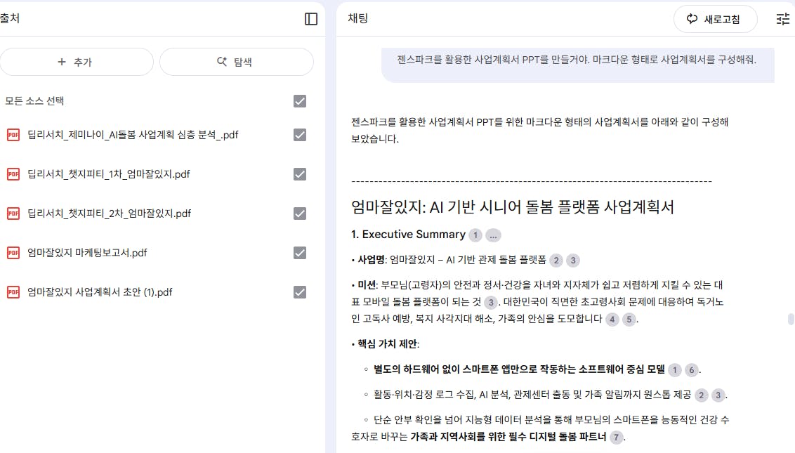 사업계획서, 마케팅 계획서, 2개의 딥리서치 자료를 넣고 노트북 LM에 넣었습니다. 그리고 단순하게 PT할 사업계획서를 작성해달라고 했습니다. 복잡한 프롬프트 없이 단순하게 마크다운 형태로 작성해달라고 했습니다.