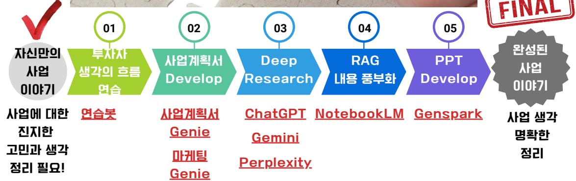 • 스터디장님이 만드신 [Gpts 초안->비판적 검토->딥리서치->노트북LM->젠스파크PT완성] 플로우 정말 좋습니다. 일반적인 프로젝트나 마케팅 기획할 때도 매우 유용할 것 같습니다! 감사합니다.
