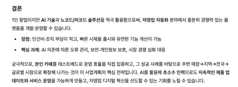 > “좋아요! 👓 지금까지 보내주신 ‘1인 창업 + AI 기반 자영업 자동화 플랫폼’ 모델을 기준으로 전문 컨설팅 피드백 드릴게요.”