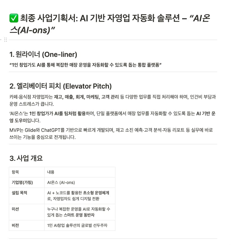 “1인 창업가가 AI를 도구 삼아, 자영업 자동화 솔루션을 만드는 일”이었습니다.