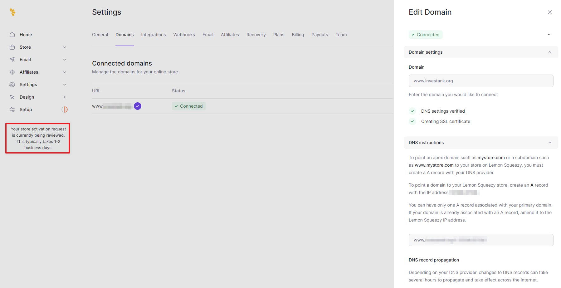• 스토어를 오픈한다고 바로 열리는 게 아니라, 레몬스퀴지 측에서 리뷰를 하고 난 다음 열리는 구조인 것 같습니다. 화면 왼쪽 아래 보시면 리뷰에 1~2 영업일이 걸린다고 합니다.
