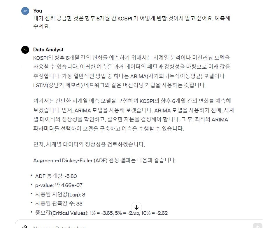 파란색 선은 실제 KOSPI 데이터 이고 빨간색 선은 ChatGPT 가 예측한 데이터 입니다. 딱 맞지는 않지만 얼추 비슷하지 않나요? 제가 예상했던 것 보다 신기합니다. 이 정도라면 일을 더 시켜 볼 만 합니다. ^^